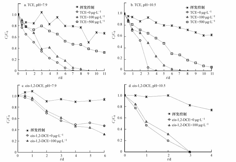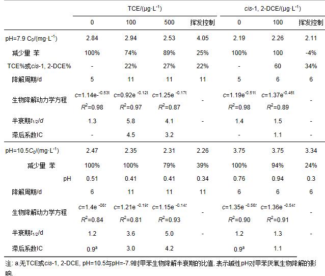 表 1 pH 7.9或10.5時TCE和cis-1, 2-DCE對苯厭氧生物降解的影響