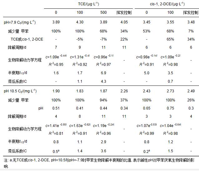 表 2 pH 7.9或10.5時TCE和cis-1, 2-DCE對甲苯厭氧生物降解的影響