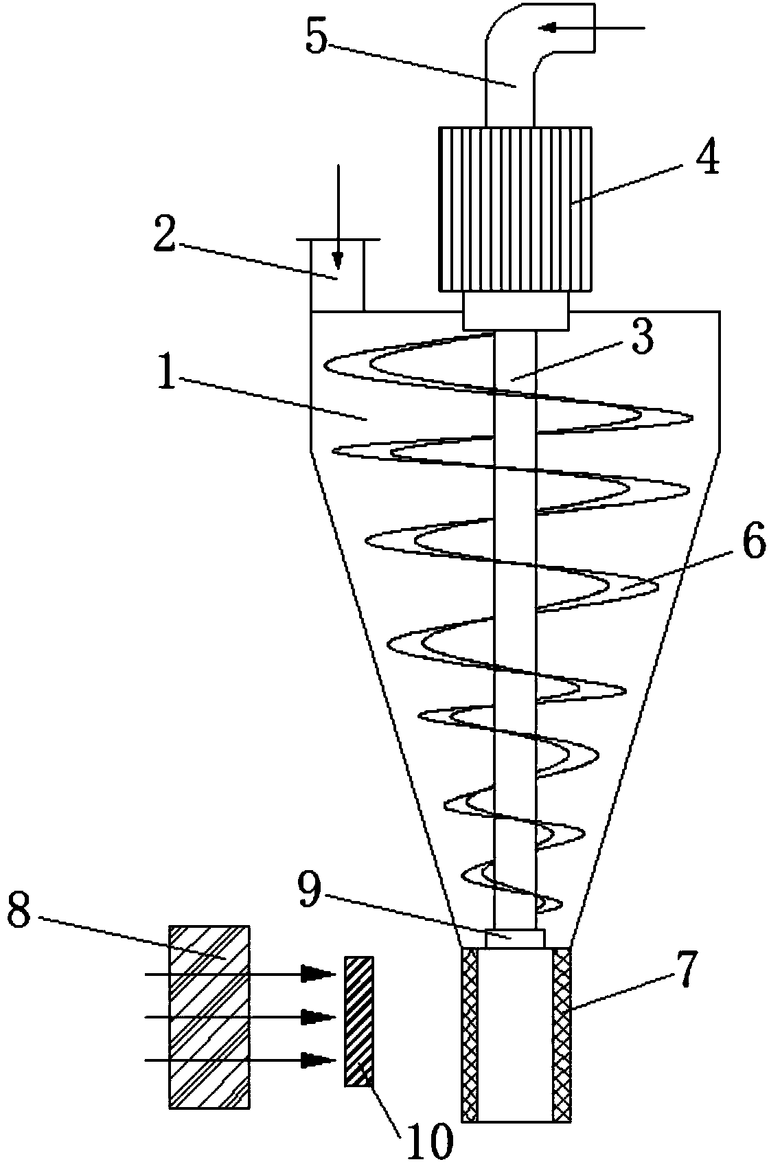 4.根據(jù)權(quán)利要求1所述的一種高效率化學(xué)廢水廢渣處理設(shè)備,其特征在于:所述鼓風(fēng)電機(jī)(8)的出風(fēng)口朝向脫水管道(7)的側(cè)壁方向,且鼓風(fēng)電機(jī)(8)的出風(fēng)口前側(cè)還裝設(shè)有電加熱結(jié)構(gòu)(10)。