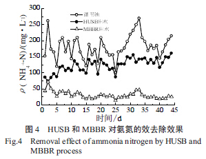 從圖4 和圖5 中可以看出,HUSB 對(duì)氨氮和磷具有一定的去除效果,平均去除率分別為18.9%和18.6%。而MBBR 對(duì)氨氮和磷去除效果,則平均分別為77.5%和72.1%。具體參見http://www.dowater.com更多相關(guān)技術(shù)文檔。