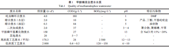 某公司所排放的甲胺磷廢水主要由甲胺磷等各種農(nóng)藥制劑生產(chǎn)過程中產(chǎn)生的廢水,如甲基氯化物、二甲胺、吡蟲啉等成分混合而成,pH 約為9~10,COD 范圍在20~30 g/L,鹽度大于15%, B/C比小于0.1,可生化性差,其中,高濃度甲胺磷有機(jī)廢水總量約178.3 m3/d,低濃度甲胺磷生產(chǎn)廢水總量約2 000 m3/d。