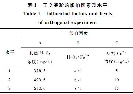 正交實(shí)驗(yàn)選擇溶液中初始H2O2濃度、H2O2:Fe2+的摩爾比、Cu2+濃度作為實(shí)驗(yàn)的影響因素,判斷=個(gè)因素對(duì)體系的影響作用大小排序。每個(gè)影響因素選擇=個(gè)有代表性的水平(見表1)。