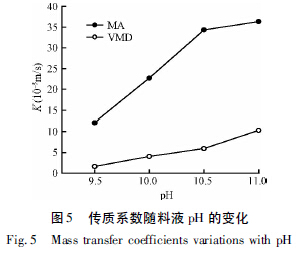 如圖5 所示,pH 值對VMD 和MA 實(shí)驗(yàn)的傳質(zhì)系數(shù)影響很大,K 值先開始迅速提高后又趨于緩慢增加,隨著pH 由9.50 增大到11.0,2個膜過程的K值分別由1. 64 × 10-5 m/s、12.11 × 10-5 m/s 升高到了10.33 × 10-5 m/s、36.33 × 10-5 m/s,分別提高到初始K 值的6.3 倍和3.0 倍。這種現(xiàn)象可以通過NH3在水溶液中的電離平衡解釋,提高溶液的pH值,OH-濃度增大,平衡方程h2o向右移動,生成的氨氣越多,從而提高了膜兩側(cè)的蒸氣壓差,提高了傳質(zhì)動力,導(dǎo)致K 值增大。