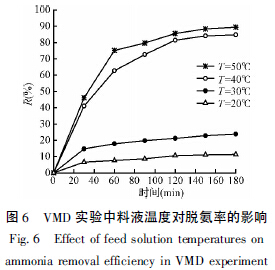 料液進(jìn)口溫度對VMD 脫氨實(shí)驗(yàn)過程的影響很顯著,隨著溫度的增加,脫氨速度和效率明顯提高,當(dāng)溫度設(shè)置在20℃和30℃時脫氨效率較低。在料液進(jìn)口溫度達(dá)到40℃時,VMD 脫氨效率明顯提高,料液進(jìn)口溫度調(diào)節(jié)到50℃脫氨效率進(jìn)一步提高,但過高初始料液溫度會導(dǎo)致整個工藝能耗大大增加。