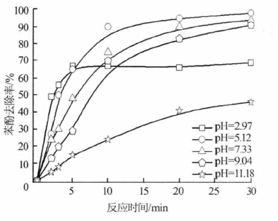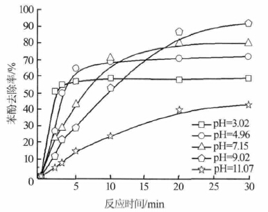 pH=3.02 時(shí),K2FeO4 氧化性能比較強(qiáng),但卻比較不穩(wěn)定,K2FeO4 還未來(lái)得及與苯酚完全反應(yīng)就分解了,與苯酚的反應(yīng)時(shí)間短,導(dǎo)致苯酚去除率不高。pH= 9.02 時(shí),K2FeO4 的氧化性不及在pH 較低的情況下高,但穩(wěn)定性較好,相對(duì)來(lái)說(shuō)與苯酚的反應(yīng)時(shí)間延長(zhǎng)了,其對(duì)苯酚的氧化分解作用達(dá)到比較大。pH=11.07 時(shí),K2FeO4 的氧化性能比較弱,因此對(duì)苯酚的去除效果比較差。