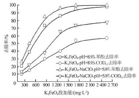 2.5 K2FeO4及NaClO- K2FeO4聯(lián)用對(duì)苯酚和CODCr的去除效果對(duì)比