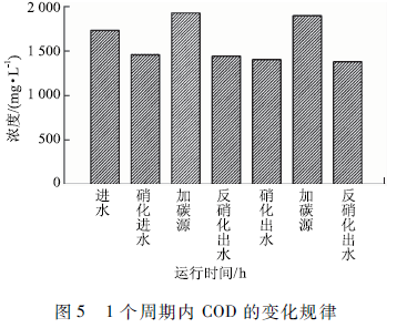 周期實驗將一個SBR運行周期(從進水到出水)分成2個子周期,每個子周期包括好氧和缺氧2個階段,分別進行曝氣和缺氧攪拌,形成好氧/厭氧的周期運行方式。由圖5可知,經(jīng)過2次硝化反硝化反應(yīng),體系中COD由1 786降至1 440 mg / L,去除率為19.3% ,B/C比由0. 157降至0. 036,可見處理后廢水可生化性極低。圖5中還可看出,2次硝化出水和反硝化出水中COD含量基本一致,說明經(jīng)過硝化反應(yīng)剩余COD很難再被反硝化細菌利用。結(jié)合4個階段運行參數(shù)的調(diào)整情況可知,無論曝氣時間長短、曝氣量大小以及有無外加碳源,系統(tǒng)對COD的去除率始終維持在20%上下。分析認為,纖維素乙醇廢水中纖維素、半纖維素、木質(zhì)素含量較高,且纖維素具有高度的序晶體結(jié)構(gòu),須經(jīng)過深度處理,破壞晶體結(jié)構(gòu),降低聚合度。為了進一步去除COD,胡豫娟等利用Fenton氧化法深度處理纖維素乙醇廢水,獲得了良好的COD去除效果。