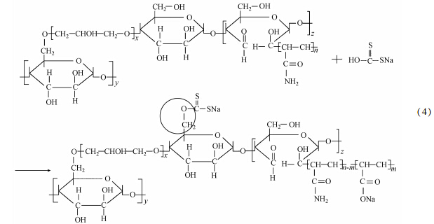采用交聯(lián)淀粉為母體,在酸性條件下以硝酸鈰銨為引發(fā)劑,以丙烯酰胺為單體,合成交聯(lián)淀粉-聚丙烯酰胺接枝共聚物(CSA);又在堿性條件下,使該接枝共聚物與二硫化碳作用,生成交聯(lián)淀粉-聚丙烯酰胺-黃原酸酯(CSAX).由于其結(jié)構(gòu)中同時(shí)存在重金屬離子的強(qiáng)配位基黃原酸基和具有絮凝功能的聚丙烯酰胺側(cè)鏈,因而可同時(shí)捕集重金屬離子和去除濁度.其中CSA與二硫化碳的反應(yīng)可以用式(3)~式(4)表達(dá).
