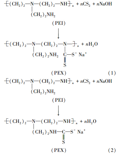 其中PEX是在堿性條件下使聚乙烯亞胺(PEI)與二硫化碳(CS2)發(fā)生黃原酸化反應(yīng),在其分子上引入二硫代羧基,從而獲得的具有捕集重金屬離子和去除濁度雙重功能的高分子絮凝劑.PEX的制備原理可以用式(1)~式(2)表達(dá).