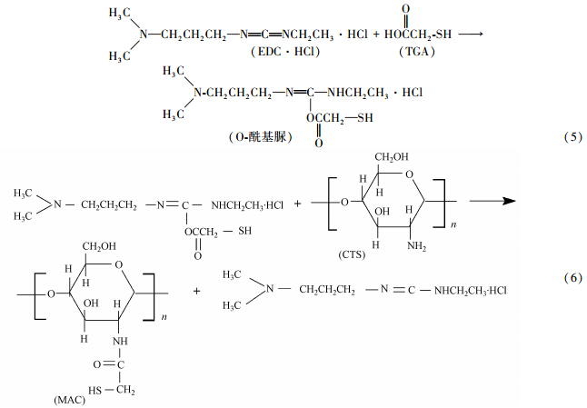 其中MAC是以殼聚糖(CTS)、巰基乙酸(TGA)為原料,以EDC鹽酸(EDC · HCl)為活化劑,通過(guò)酰胺化反應(yīng)在CTS分子上接上對(duì)重金屬離子有強(qiáng)配位能力的巰基乙酰,從而合成的具有捕集重金屬和除濁雙重功能的高分子絮凝劑.制備原理可以用式(5)~式(6)表達(dá).