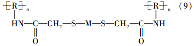 PEX捕集重金屬離子的主要作用機(jī)理包括了重金屬離子與PEX分子鏈上的二硫代羧基的配位或螯合作用及與PEX分子鏈上的胺基的配位作用,其中與二硫代羧基的螯合作用發(fā)揮主要的捕集功能,它可以是重金屬離子與同一分子鏈上的兩個(gè)以上相鄰配位基之間的螯合,也可以是重金屬離子與分屬于多個(gè)分子鏈上配位基之間的螯合,以后者為例,表示如下: