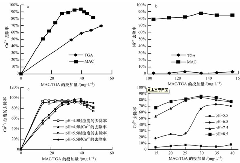 取濃度為25 mg · L-1的僅含銅或鎳水樣,將其pH值分別調(diào)整為5.3和7.8,分別投加不等量的MAC、TGA作絮凝實(shí)驗(yàn),對(duì)比它們?nèi)コ亟饘匐x子的性能,結(jié)果如圖 8a、8b所示;取濃度為25 mg · L-1的含銅(并含濁)水樣或含鎘水樣,將其pH值分別調(diào)整為不同值,投加不等量的MAC,絮凝沉淀后,測(cè)定水中殘余重金屬的濃度,研究在不同pH值時(shí)MAC對(duì)重金屬的去除效率,實(shí)驗(yàn)結(jié)果如圖 8c,8d所示.