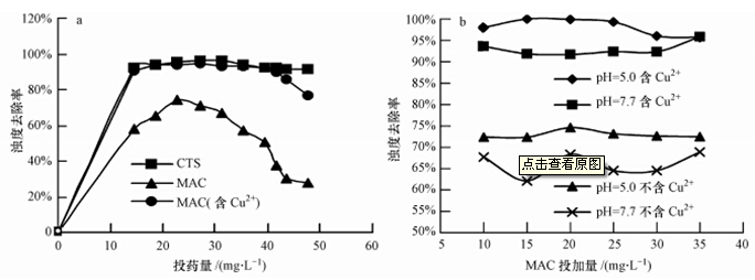 取pH=5.5,濁度為90 NTU的水樣,按以下方法做絮凝實(shí)驗(yàn)以期比較:①單獨(dú)投加殼聚糖溶液除濁;②單獨(dú)投加MAC除濁;③在有Cu2+(25 mg · L-1)的條件下,投加MAC除濁,結(jié)果如圖 7a所示.在濁度為160 NTU的高嶺土懸濁液中(含25 mg · L-1 Cu2+),調(diào)節(jié)溶液pH值至不同值,投加MAC除濁,結(jié)果見(jiàn)圖 7b.