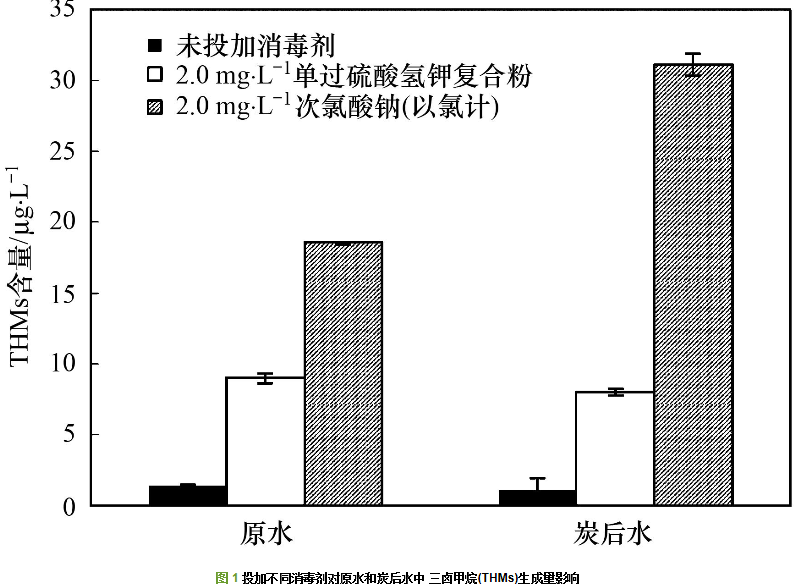 (2) 測試水樣經(jīng)氯消毒后的三鹵甲烷(THMs)和鹵乙酸(HAAs)生成量明顯高于經(jīng)單過硫酸氫鉀復(fù)合粉消毒后的生成量. 單過硫酸氫鉀復(fù)合粉消毒后雖然有DBPs生成,但其含量較低,并明顯低于氯消毒.