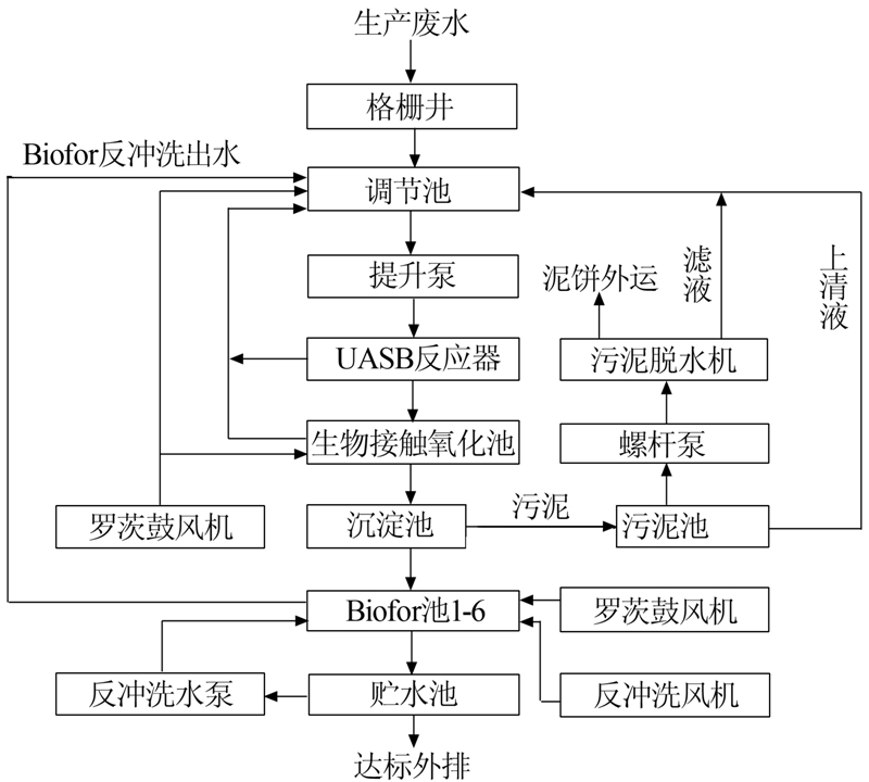 根據(jù)進(jìn)水水質(zhì)和水量情況,結(jié)合調(diào)研情況和實(shí)驗室小試及中試結(jié)果進(jìn)行處理工藝的優(yōu)化組合,確定了“UASB—生物接觸氧化池—Biofor工藝的序批式運(yùn)行處理工藝,廢水處理站設(shè)計處理水量為600 m3/d,工藝流程如圖 1所示。