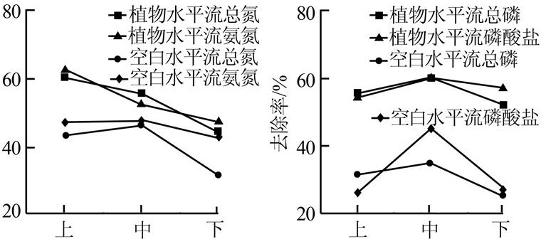 為提高水平潛流人工濕地的處理效果和預防堵塞,實驗在濕地上、下基質層采用大粒徑礫石,以利于濕地通過上部空間進行富氧及植物根系向濕地下部深處進行繁殖;中間層采用小粒徑礫石,便于增加礫石表面積,從而加大濕地基質與污水的接觸面積和微生物的附著面積。濕地對營養(yǎng)物去除率的空間變化情況如圖 3所示。