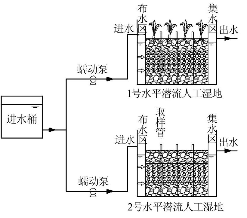 于西安建筑科技大學校內構建2組結構相同的由有機玻璃構成的水平潛流人工濕地(尺寸均為0.75 m×0.4 m×0.8 m)。為了獲得較好的水力性能和處理效果,實驗采用了不同粒徑的填料組成,其礫石粒徑配比從下到上為15 cm大粒徑(d:15~30 mm)、25 cm小粒徑(d:5~15 mm)、15 cm大粒徑(d:15~30 mm),基質孔隙率為50%。1號濕地為種植蘆葦?shù)乃綕摿鳚竦,種植密度為13株/m2,2號濕地為未種植植物的空白水平潛流濕地。礫石、蘆葦均取自西安皂河附近。