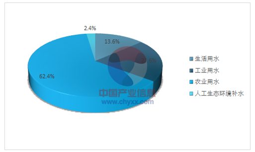 資料來(lái)源:智研咨詢整理、水利部水資源的需求幾乎涉及到國(guó)民經(jīng)濟(jì)的方方面面,如工業(yè)、農(nóng)業(yè)、建筑業(yè)、居民生活等,嚴(yán)重的缺水問題導(dǎo)致我國(guó)城鎮(zhèn)現(xiàn)代化建設(shè)進(jìn)程、GDP 的增長(zhǎng)和居民生活水平的提高都受到了限制。2016年全國(guó)總用水量6040.2億m3。其中,生活用水占總用水量的13.6%;工業(yè)用水占21.6%;農(nóng)業(yè)用水占62.4%;人工生態(tài)環(huán)境補(bǔ)水(僅包括人為措施供給的城鎮(zhèn)環(huán)境用水和部分河湖、濕地補(bǔ)水)占2.4%。2016年我國(guó)水資源的具體用水比例情況