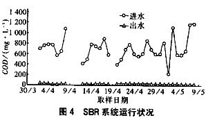 UASB正常運(yùn)行后,厭氧出水和鍋爐廢水混合后的COD濃度比以前大大降低,但水質(zhì)波動(dòng)仍然很大(COD濃度在400~1 200 mg/L之間)。盡管如此,SBR的出水COD濃度始終保持在20~40 mg/L之間。從實(shí)際運(yùn)行來看,該系統(tǒng)經(jīng)過改造后,SBR反應(yīng)池運(yùn)行更加穩(wěn)定,出水水質(zhì)較好。圖4為SBR反應(yīng)池進(jìn)、出水COD濃度的變化情況,整個(gè)系統(tǒng)監(jiān)測結(jié)果見表4。