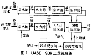保留原有的SBR工藝,將水解/酸化反應(yīng)池改造成UASB反應(yīng)池的過程中,同時(shí)實(shí)行清污分流,將冷卻水直接排放,高濃度廢水先經(jīng)過UASB池處理,出水再與低濃度廢水混合進(jìn)入SBR反應(yīng)池。整個(gè)工藝流程如圖1所示。