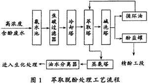 該廠各種高濃度含酚廢水流入氨水池均化,池底的焦化類物質(zhì)定期抽出。高濃度含酚廢水經(jīng)焦碳過濾器除油,使出水符合進(jìn)生化處理裝置的要求。吸附油的焦碳定期用蒸汽吹脫。除油后的含酚廢水經(jīng)冷卻器冷卻至55~65℃進(jìn)入萃取塔上部。萃取劑選用N-503煤油,由循環(huán)油泵打入萃取塔底部。溶劑油與高濃度含酚廢水在萃取塔中逆流接觸,絕大部分酚轉(zhuǎn)移至溶劑油中,溶劑油由萃取塔頂溢流進(jìn)入堿洗塔與堿接觸生成酚鹽。溶劑油經(jīng)堿洗后進(jìn)入中間油槽,循環(huán)使用。
