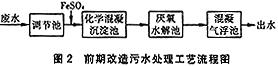 由于該項改造工程具有很強的實用性,實際上是邊生產(chǎn)、邊研究、邊制定方案的改造過程,在確定物化處理流程時,先做了大量的化學混凝脫色試驗。采用傳統(tǒng)方法,對硫酸亞鐵、凈水劑、聚合鋁和三氯化鐵主要以去除色度、COD為目標,通過小試先確定適合本廠的脫 色效果和去除COD的比較佳藥劑為硫酸亞鐵,其比較佳投藥量在800~1000mg/L,比較佳pH值范圍在9.5~11之間。