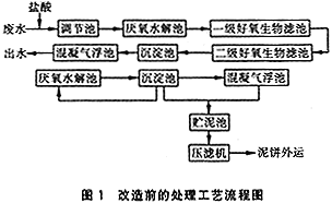 捷德紡織廠采取邊改造邊生產(chǎn)的方式進行。由于二級生物濾池對有機物的降解率只有30%~4 0%,且滋生蚊蠅,決定利用現(xiàn)有的厭氧水解池,打掉二級生物濾池,改成生物接觸氧化池。 但厭氧水解池對COD的去除率僅有10%~20%,大量負荷會帶給后續(xù)處理構筑物,為減少生化改造期間的污染,在厭氧水解池前加一套物化處理設備(即化學混凝沉淀),以降低負荷。