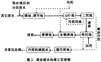 其它生產(chǎn)廢水進入隔油調(diào)節(jié)池,隔去浮油后與來自預(yù)處理后的廢水在調(diào)節(jié)池內(nèi)借助空氣預(yù)曝混合均勻后,進入A/O系統(tǒng),混合廢水首先在A池內(nèi)依靠兼氧、厭氧菌將廢水的大分子分解為小分子,使廢水的可生化性提高并去除部分CODcr,然后進入O池,廢水在O池內(nèi)再由好氧菌進一步大幅削減污染物。該工藝的生化系統(tǒng)以傳統(tǒng)A/O法為基礎(chǔ),在O段前端設(shè)置了菌種選擇器,可抑制絲狀菌的生長,有效地防止污泥膨脹;旌弦哼M二沉池,上清液去終沉池進一步投加藥劑反應(yīng)沉淀,二沉池污泥回流至A/O池,終沉池出水進生物炭池,廢水在此池內(nèi)借助微生物和活性炭協(xié)同作用使廢水得到深度處理后再澄清達標排放。A/O系統(tǒng)的剩余污泥和其他物化污泥均進入濕污泥池,經(jīng)濃縮后由脫水機壓成千泥餅外運作無害化處理,濾液返回調(diào)節(jié)池。