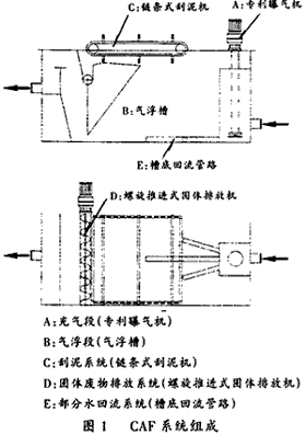 渦凹?xì)飧。–AF)系統(tǒng)是世界獨創(chuàng)的專利水處理設(shè)備,也是美國商務(wù)部和環(huán)保局的出口推薦技術(shù)。CAF是專門為去除工業(yè)和城市污水中的油脂、膠狀物及固體懸浮物(SS)而設(shè)計的系統(tǒng)。整個氣浮系統(tǒng)共由五部分組成,如圖1所示:
