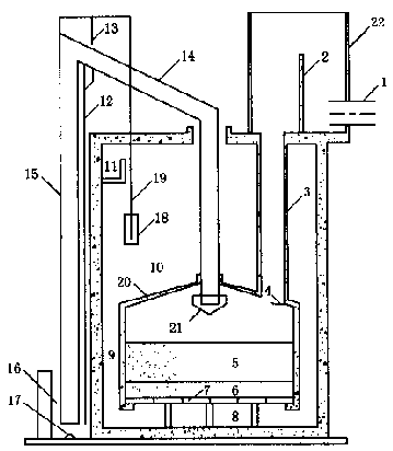 ??改造后的無閥濾池構(gòu)造見圖1。過濾時(shí)的工作情況:渾水經(jīng)進(jìn)水總管1流入進(jìn)水分配箱22,由進(jìn)水分配堰2進(jìn)入豎井進(jìn)水渠3,經(jīng)消能板4消能后,均勻地分布在濾料層5上,通過承托層6、小阻力配水系統(tǒng)7進(jìn)入底部配水空間8。濾后水從底部配水空間經(jīng)連通區(qū)9上升到?jīng)_洗水箱 10。當(dāng)水箱水位達(dá)到出水渠11的溢流堰頂后,溢入渠內(nèi),比較后流入清水池。反沖洗時(shí)的工作情況:濾池運(yùn)行中,濾層阻力逐漸增加,虹吸上升管14中的水位相應(yīng)逐漸升高。當(dāng)水位達(dá)到虹吸輔助管12管口時(shí),水自該管中落下,并通過抽氣管13不斷將虹吸下降管15中的空氣帶走,使虹吸管中形成真空。當(dāng)虹吸上升管中的水越過虹吸管頂端與虹吸下降管中上升的水柱相匯時(shí),兩股水流匯成一股,沖出虹吸下降管管口,把虹吸管中殘存的空氣全部帶走,形成連續(xù)的虹吸流。這時(shí),水箱中的水自下而上對濾料進(jìn)行反沖洗。