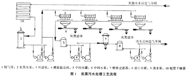 造氣車間重油氣化后,產(chǎn)生的炭黑水利用自身余壓將炭黑水送往炭黑回收車間,經(jīng)蛇管于燥器換熱后進(jìn)入脫氣塔,去除水中夾帶的CO,H2等氣體,污水經(jīng)炭黑水泵加壓后送入壓濾機(jī)過濾后,炭黑濾餅存留在濾板中,由人工拉開濾板,將濾餅卸到料斗內(nèi),經(jīng)螺旋輸送機(jī)送往干燥廠房內(nèi)進(jìn)行干燥處理后,裝袋入庫,濾后水經(jīng)中間水泵加壓后送入精密過濾器過濾,濾后清水流入清水箱,送回造氣車間循環(huán)使用,和原有工藝相比每小時(shí)節(jié)約軟水約50t,流程見圖1。