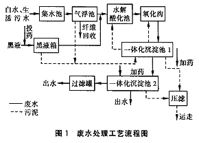 廣西某公司是一采用毛竹為原料的造紙廠,其廢水主要來源于堿液浸泡(40%燒堿)后水洗產生的黑液和抄紙機廢水——白水。其中,白水連續(xù)排放(1 200t/d),COD為700~1 200mg/L,pH值為7.2~9.5;黑液間歇排放(100t/d),COD為12 000~24 000 mg/L,pH值為9.2~11.5。此外,還有部分生活污水(約100t/d),COD為200mg/L。廢水主要成分有:纖維、纖維素分解生成的糖類、醇類、有機酸、木質素及其衍生物,少量的樹脂酸、脂肪酸等。
