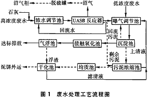 由車間排放的濃廢水自流至濃水調(diào)節(jié)池,調(diào)節(jié)pH后由污水泵提升至UASB反應(yīng)器,出水一部分回流至濃水調(diào)節(jié)池,它與UASB反應(yīng)器形成集調(diào)節(jié)、厭氧降解為一體的處理系統(tǒng);一部分自流至曝氣調(diào)節(jié)池與淡廢水混合,經(jīng)曝氣后由污水泵提升至沉淀池形成一級好氧系統(tǒng);此時(shí)沉淀池出水已近達(dá)標(biāo),再自流至接觸氧化池、氣浮池進(jìn)行好氧生化和物化處理(見圖1)。?
