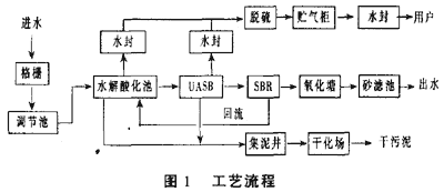 根據(jù)廢水性質(zhì),我們采用了三個處理單元去除污染物:單元采用格柵脫渣,去除廢水中粗顆粒的懸浮物,可回收作為飼料或肥料;第二單元采用脫色和水解酸化預(yù)處理,提高廢水的可生化性[2],同時沉淀去除懸浮物,通過物化作用脫色。第三單元采用厭氧、好氧、兼氧生化處理,徹底降解有機物。厭氧采用上流式厭氧流化床反應(yīng)器(UASB)[3],好氧采用間歇式活性污泥反應(yīng)池(SBR)[4],整個處理系統(tǒng)耐沖擊負(fù)荷能力強。