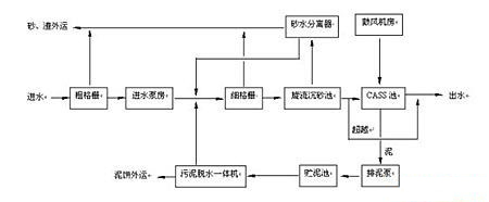 技術(shù)特點與優(yōu)勢: ● 投資費用低 改良型氧化溝工藝采用微孔曝氣(或大功率機械曝氣)與機械推流方式配合運行,可以使氧化溝設(shè)計有效水深達到 5.0米以上,占地面積大幅減小,投資費用大幅降低。 ● 運行費用低 改良型氧化溝工藝采用高效曝氣方式,工藝根據(jù)進水水質(zhì)地不同可調(diào)節(jié)回流污泥分配,可大幅節(jié)省設(shè)備運行費用,從而降低運行費用。 ● 運行管理方便 改良型氧化溝工藝成熟,運行穩(wěn)定,常規(guī)管理方便。 CASS 工藝 CASS(Cyclic Activated S1udge System) 工藝是普通 SBR 工藝的一種改進型工藝。 CASS 反應(yīng)池由預(yù)反應(yīng)區(qū)和主反應(yīng)區(qū)組成,預(yù)反應(yīng)區(qū)控制在缺氧狀態(tài),因此,提高了對難降解有機物的去除效果提高。 CASS 進水是連續(xù)的,因此進水管道上 無電動控制閥 ,單個池子可獨立運行 。 CASS 工藝可以根據(jù)脫氮除磷效果的要求,將預(yù)反應(yīng)區(qū)分成厭氧、缺氧兩段。在工藝運行過程中,可根據(jù)實際污泥性狀和除磷要求選擇回流裝置的開啟。 CASS 工藝處理流程簡圖如下: ![]()