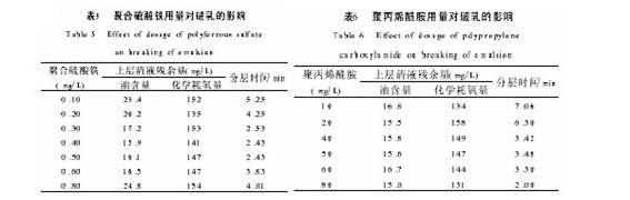 實驗過程中條件控制為:pH始=1.5,pH終=7.0,聚丙烯胺為80mg L,對不同用量聚合硫酸鐵時破乳的情況進行了研究,試驗結(jié)果如表5。