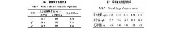 合分析,確定適合于含油廢水分離的比較佳條件為:聚合硫酸鐵為0.4mg L,pH始為3.0,pH終為7.0,聚丙烯酰胺為80mg L,腐植酸鈉為0.20mg L,在該條件下,凈化后水中油含量為4.5mg L,化學(xué)耗氧量為61.5mg L,沉降時間為2min。比較后以1#、2#、3#水樣做實驗,結(jié)果如表8。